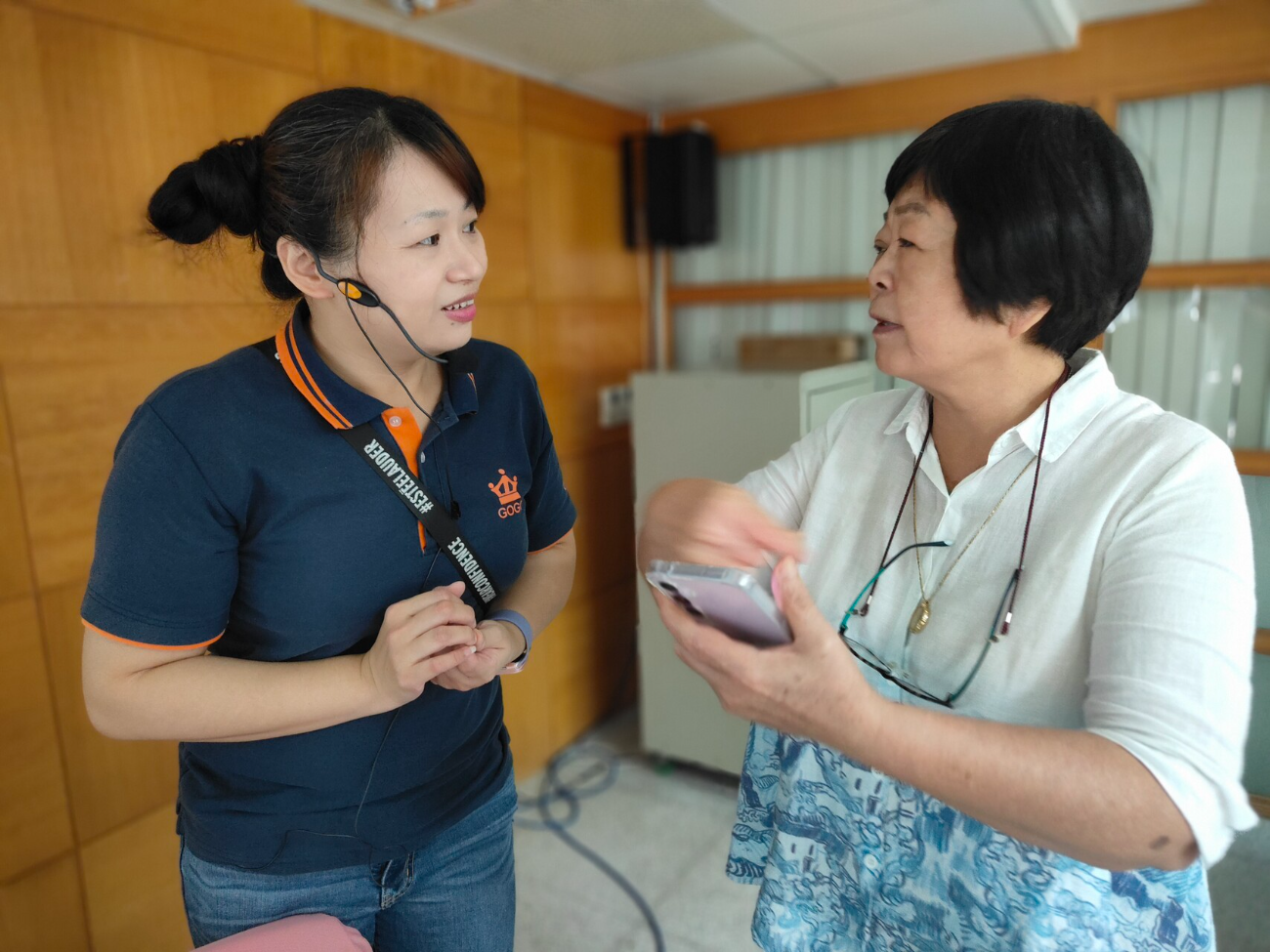 老師聽見後立刻走到長輩身旁,微笑地說:「沒關係,我們一起來看,慢慢來就好。」
